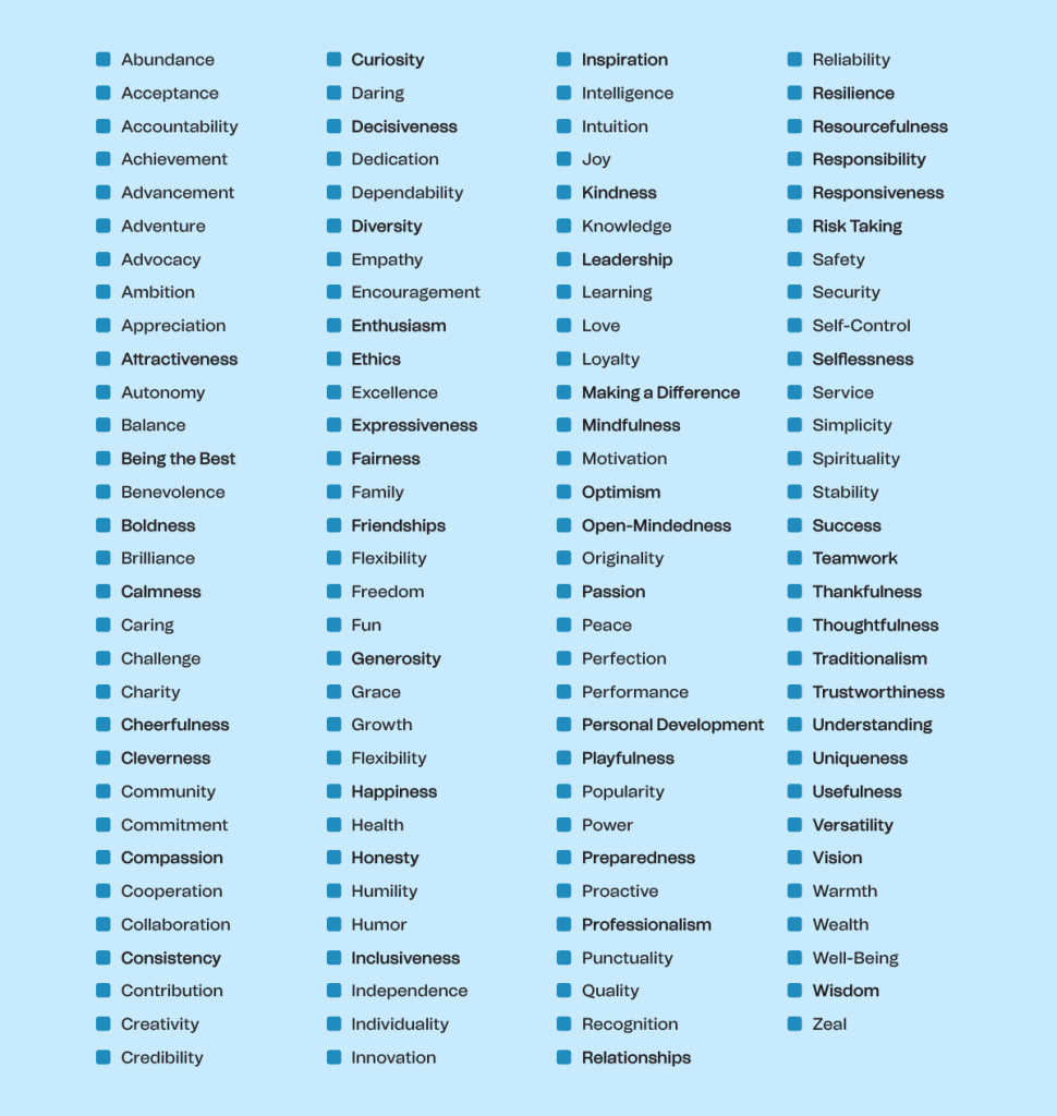 From the list below, choose and write down every word or trait that resonates with you. It may resonate because it’s something that is important to you, because it is a way you strive to be or act, or something you strive to incorporate into your life. Do not overthink your selections. As you read through the list, simply write down the words that feel like a core value to you personally. If you think of a value that is not on the list, be sure to write it down as well.